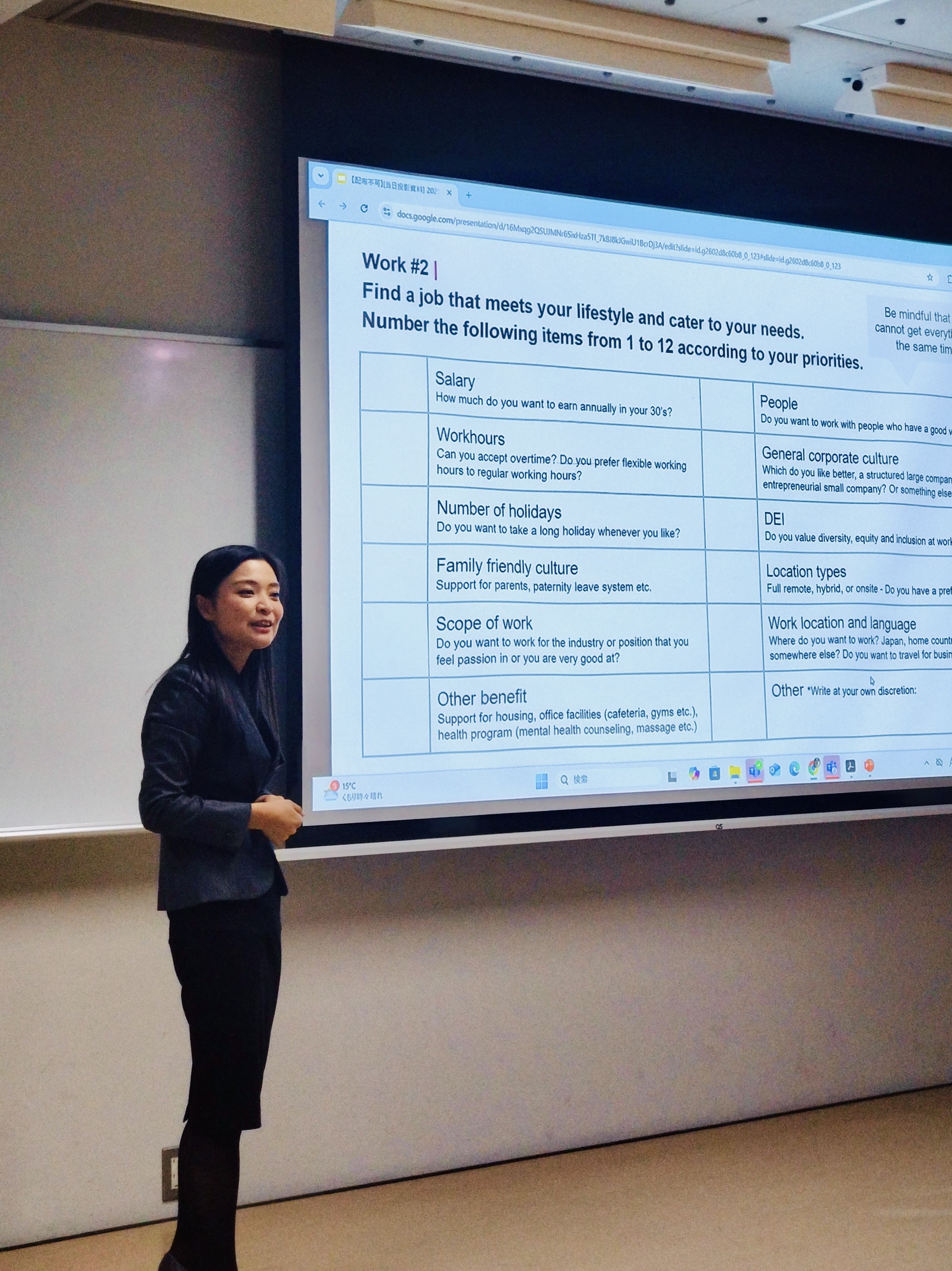 講義では「キャリアにおけるWellness」をテーマに、Wellnessの大切さから、理想のライフスタイルの構築、それを達成するための仕事の見つけ方についてお話ししました。